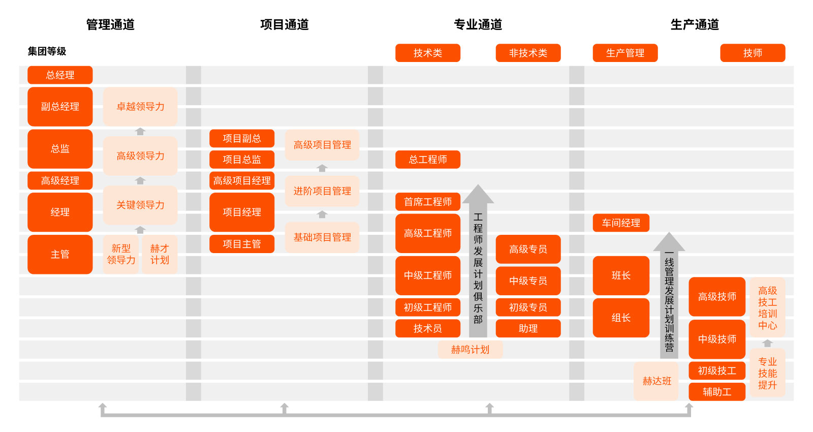 员工根据自己的定位、优势和公司的发展需求,可以在管理、项目、专业、生产等多个通道进行发展,可以充分发挥个人的优势和价值,取得职业发展的成功